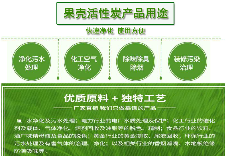 水處理應用:產品采用優質果殼、椰殼為原料,廣泛應用于飲用水、生活用水,飲料用水、自來水廠、電廠鍋爐用水、工業純水凈化,也用于各種工業廢水的凈化、提純等,可有效去除水中的有機物、異味、余氯、酚、汞、鐵、鉛、砷、鉻、硅膠、氰化物等有害物質及有效除嗅去色。