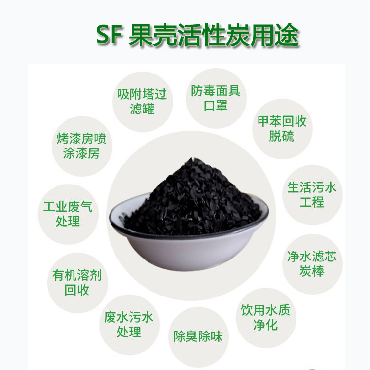水處理應用:產品采用優質果殼、椰殼為原料,廣泛應用于飲用水、生活用水,飲料用水、自來水廠、電廠鍋爐用水、工業純水凈化,也用于各種工業廢水的凈化、提純等,可有效去除水中的有機物、異味、余氯、酚、汞、鐵、鉛、砷、鉻、硅膠、氰化物等有害物質及有效除嗅去色。
